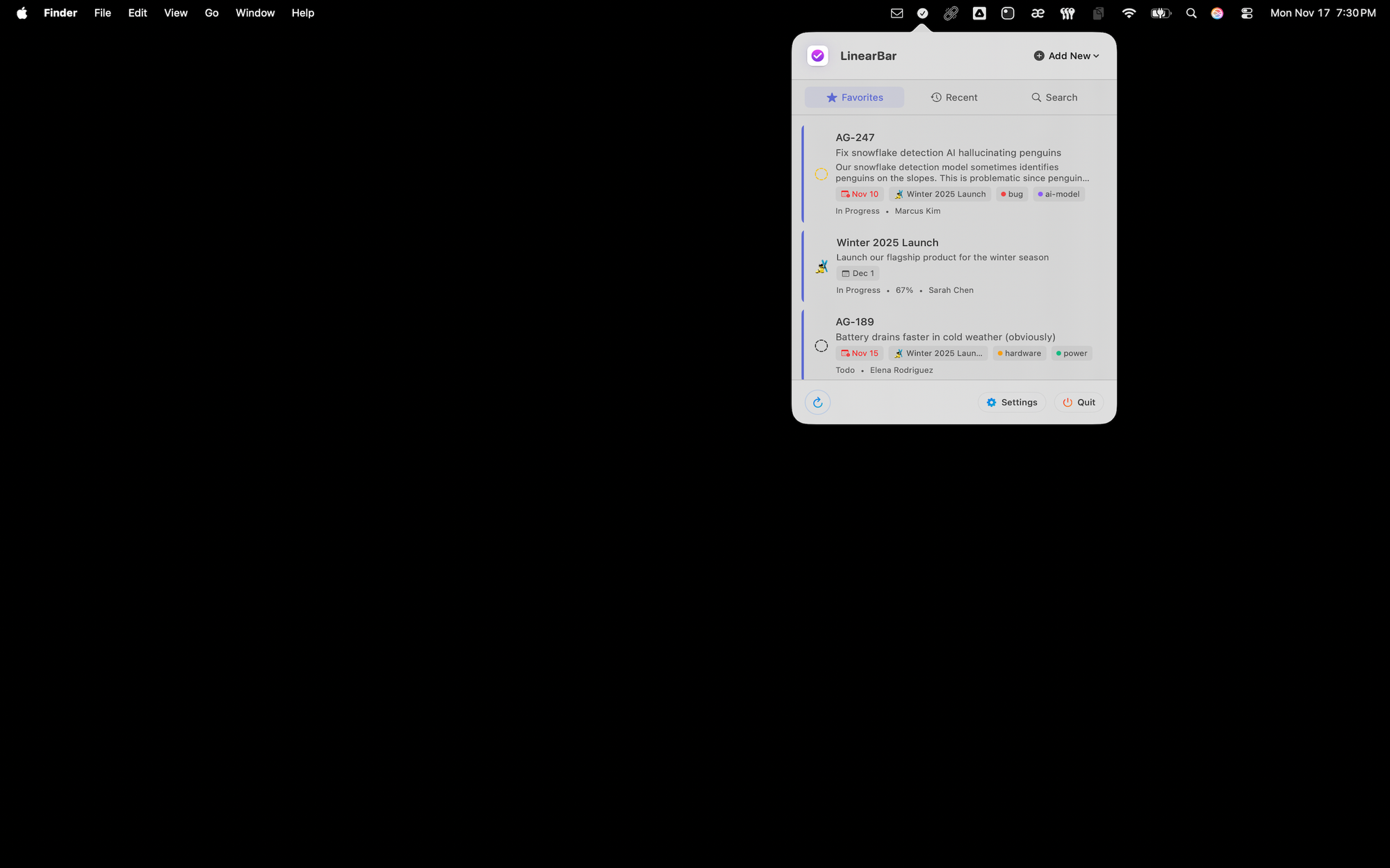 Track your Linear issues, projects, and initiatives from your menu bar. Search Linear for work that matters to you. Supports multiple Linear organizations at once with one unified Inbox.